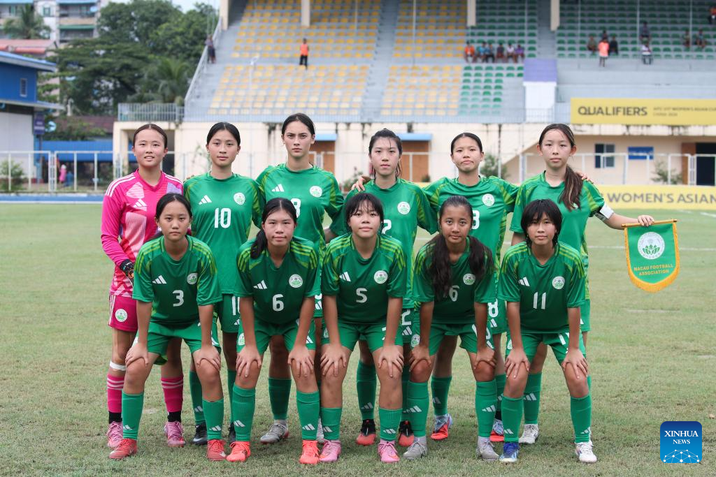 Starting players of China's Macao line up for photos before the AFC U17 Women's Asian Cup 2026 China 2026 qualifier between China's Macao and Indonesia in Yangon, Myanmar, Oct. 13, 2025. (Xinhua/Myo Kyaw Soe)