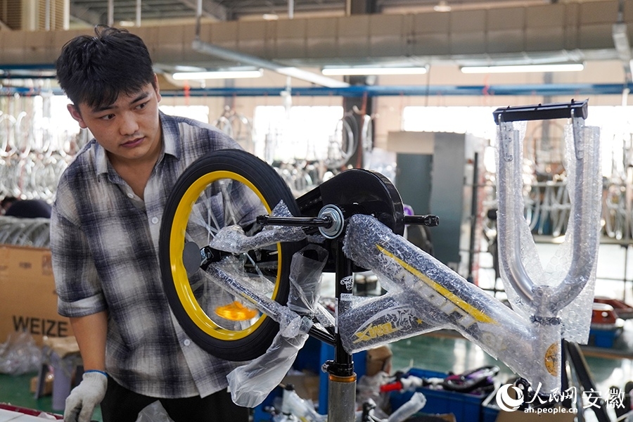 A worker assembles bicycles at a workshop in the bicycle industrial park in Wuhe county, Bengbu city, east China's Anhui Province. (People's Daily Online/Chen Ruotian)