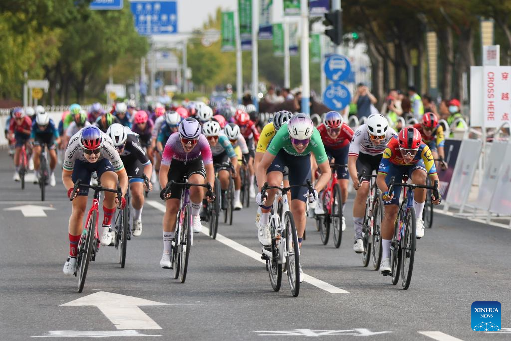 Cyclists compete during the Stage 2 of the UCI Women's WorldTour Tour of Chongming Island road cycling race in Shanghai, east China, Oct. 15, 2025. (Xinhua/Wang Xiang)