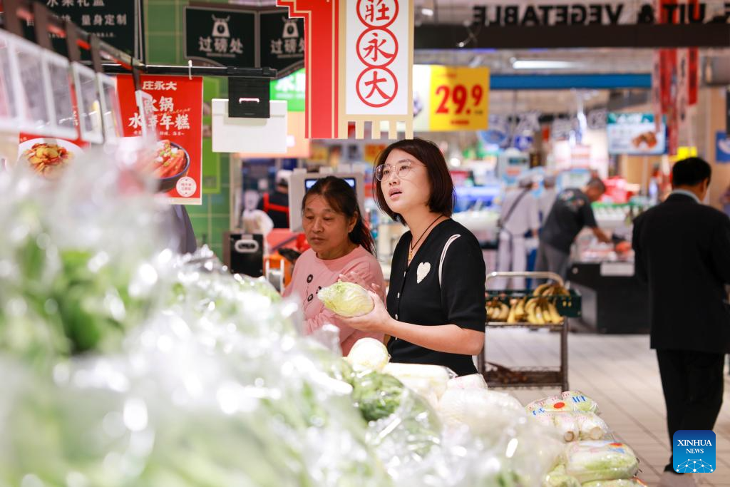 Customers select vegetable at a supermarket in Taixing City, east China's Jiangsu Province, Oct. 15, 2025.(Photo by Gu Jihong/Xinhua)