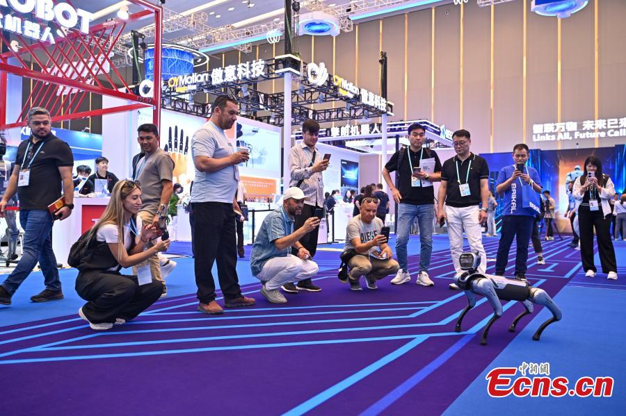 A quadruped robot attracts buyers at the 138th edition of the China Import and Export Fair in Guangzhou, Guangdong Province, Oct. 15, 2025. (Photo: China News Service/Chen Jimin)