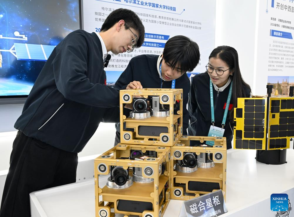 Representatives from Harbin Institute of Technology introduce the model of their project during a college students' innovation achievements exhibition in Zhengzhou, central China's Henan Province, Oct. 14, 2025. Six teams from domestic and international colleges took part in the final of the competition here on Wednesday. (Xinhua/Hao Yuan)