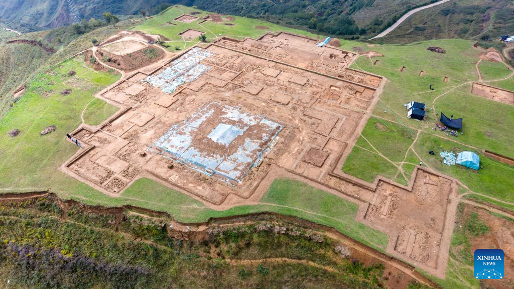 An aerial drone photo taken on Oct. 15, 2025 shows a view of the Sijiaoping site in Lixian County, Longnan City of northwest China's Gansu Province. Located in Lixian County, Longnan City of Gansu, the Sijiaoping site is a large-scale ritual building complex designed with a symmetrical layout.
