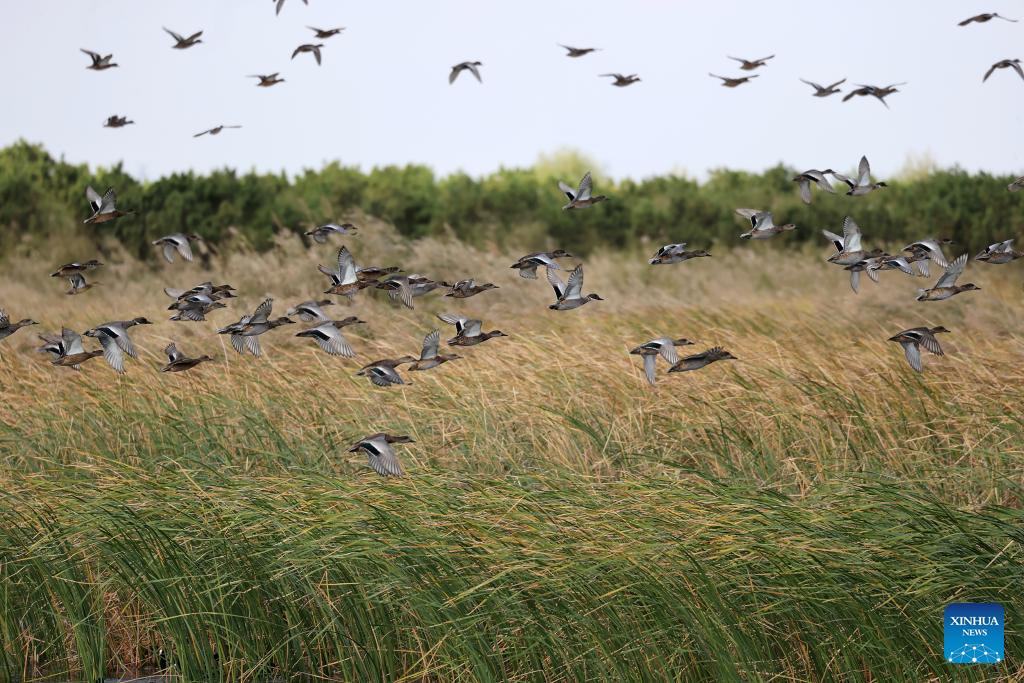 Migratory birds fly over the Yellow River Delta National Nature Reserve in Dongying, east China's Shandong Province, Oct. 18, 2025. People are heading outdoors to enjoy the pleasant autumn days across China. (Photo by Zhou Guangxue/Xinhua)