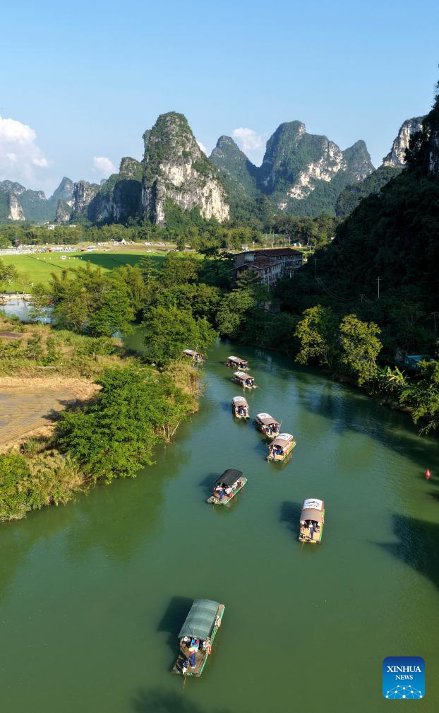 Tourists ride bamboo rafts on a river in Daxin County of Chongzuo, south China's Guangxi Zhuang Autonomous Region, Oct. 18, 2025. People are heading outdoors to enjoy the pleasant autumn days across China. (Photo by Li Hanchi/Xinhua)