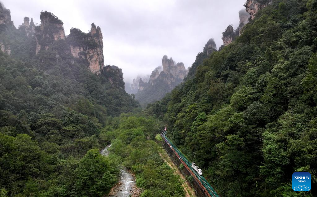 An aerial drone photo taken on Oct. 19, 2025 shows tourists taking a sightseeing tram to visit the Ten-Mile Gallery at the Zhangjiajie National Forest Park in Zhangjiajie, central China's Hunan Province. People are heading outdoors to enjoy the pleasant autumn days across China. (Photo by Wu Yongbing/Xinhua)