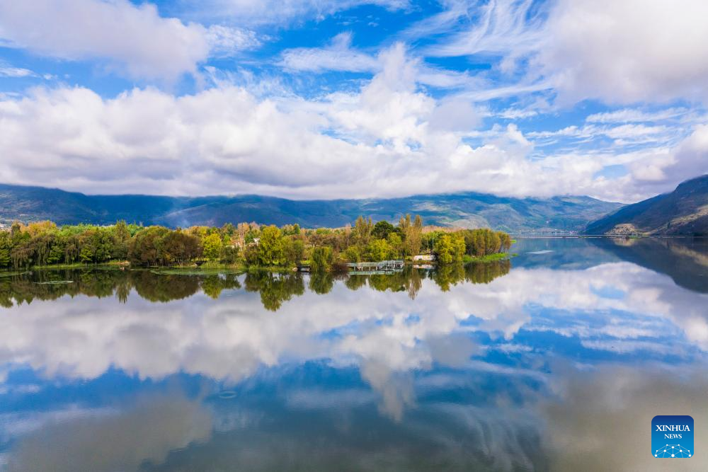 An aerial drone photo taken on Oct. 18, 2025 shows the scenery of a lake in Eryuan County of Dali Bai Autonomous Prefecture, southwest China's Yunnan Province. People are heading outdoors to enjoy the pleasant autumn days across China. (Photo by Luo Xincai/Xinhua)