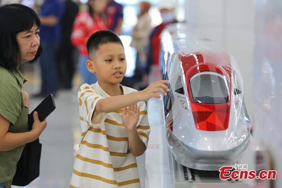 A mom and a child visit the model of a high-speed train at the Halim Station of the Jakarta-Bandung High-Speed Railway in Jakarta, Indonesia, Oct. 17, 2025, local time. (Photo: China News Service/Li Zhiquan)
