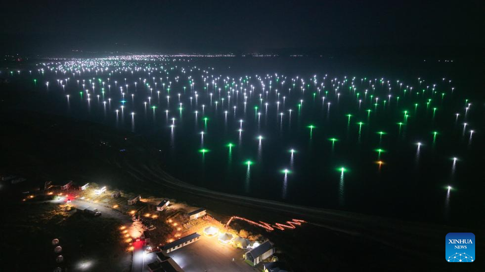 A drone photo taken on Oct. 17, 2025 shows fishing light attractors in the Longyang Gorge area in Gonghe County of Hainan Tibetan Autonomous Prefecture, northwest China's Qinghai Province. Each year from late August to late November, fishermen in Longyang Gorge are busy harvesting silver fish.