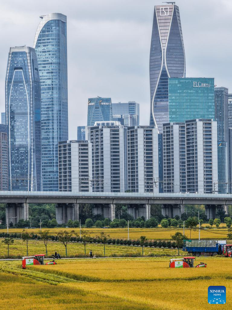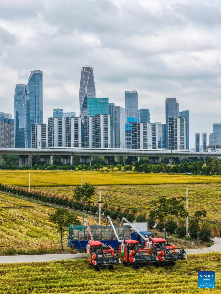 A drone photo taken on Oct. 21, 2025 shows harvesters harvesting rice in a paddy field, with a high-speed train in the background, in Hangzhou, east China's Zhejiang Province. (Xinhua/Xu Yu)