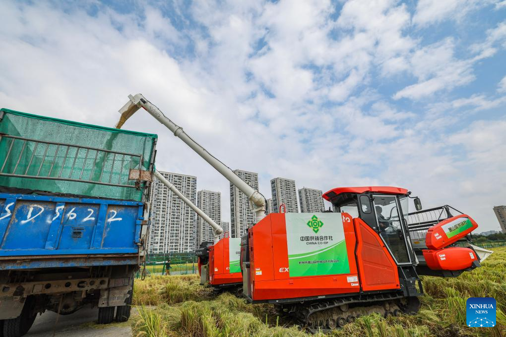 A harvester loads the harvested paddy onto a truck in Hangzhou, east China's Zhejiang Province, on Oct. 21, 2025. (Xinhua/Xu Yu)