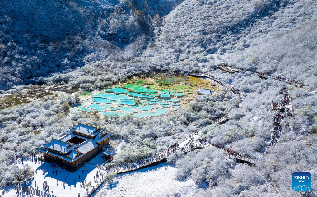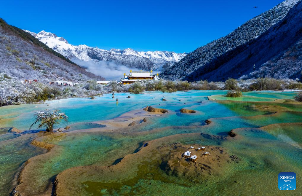 A drone photo taken on Oct. 21, 2025 shows a view of a colorful pond cluster after snow at the Huanglong scenic area in Aba Tibetan and Qiang Autonomous Prefecture, southwest China's Sichuan Province.
