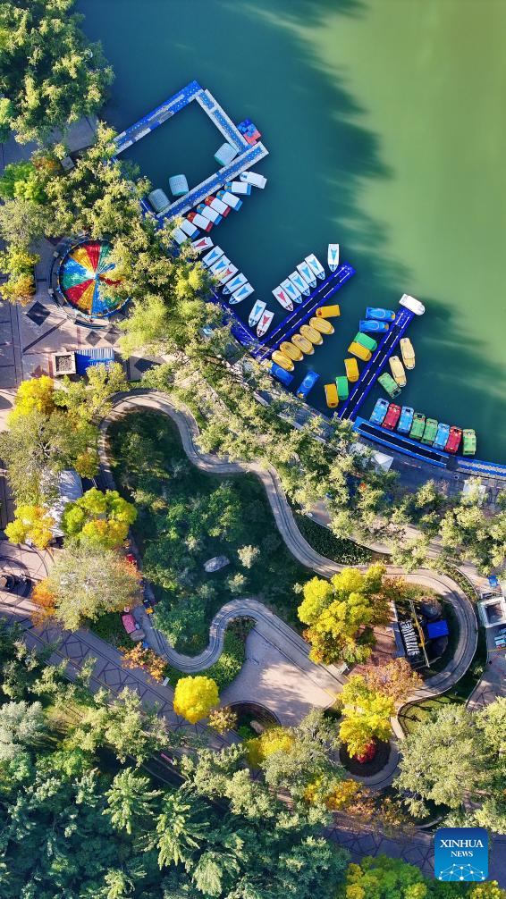An aerial drone photo taken on Oct. 17, 2025 shows the autumn scenery of a flower expo park in Yinchuan, northwest China's Ningxia Hui Autonomous Region. (Photo by Li Jing/Xinhua)