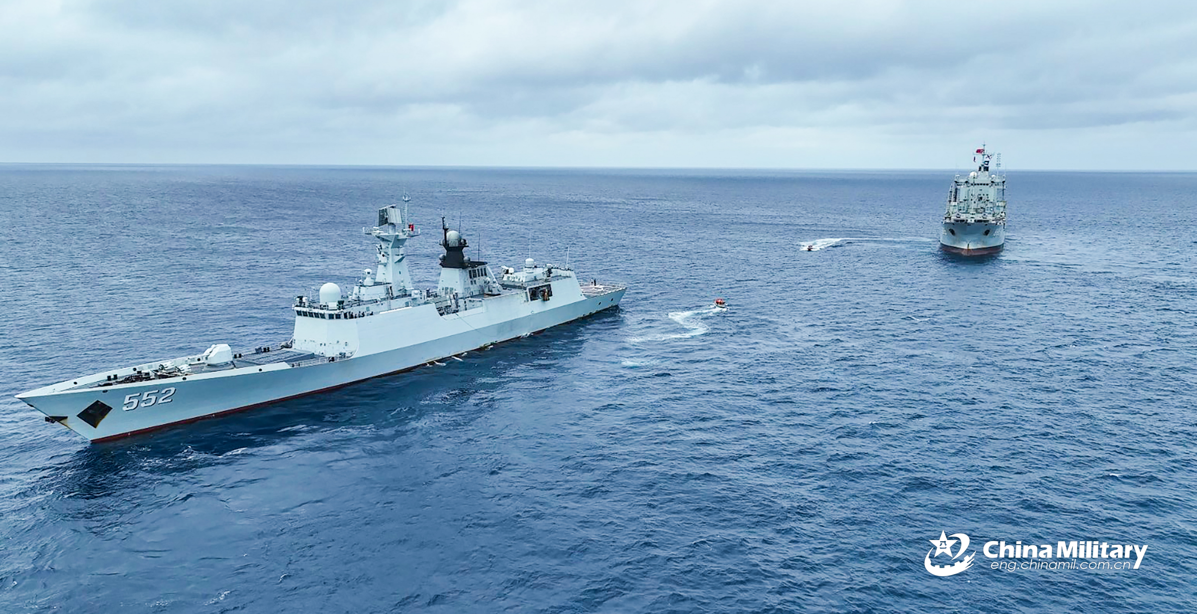 Boats attached to a flotilla with the navy under the Chinese PLA Southern Theater Command transfer supplies between frigate Chenzhou (Hull 552) and comprehensive supply ship Qinghaihu (Hull 885) during a maritime training exercise. (eng.chinamil.com.cn/Photo by Li Junlin)