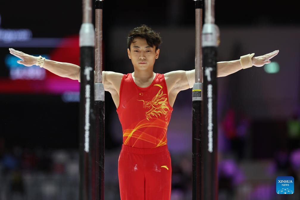 Zou Jingyuan of China prepares during the the Men's Parallel Bars Final at 53rd FIG Artistic Gymnastics World Championships in Jakarta, Indonesia, on Oct. 25, 2025. (Xinhua/Bai Xuefei)