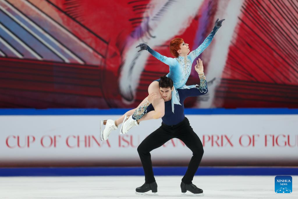 Emilea Zingas (top)/Vadym Kolesnik of the United States perform during the ice dance free dance at the Cup of China ISU Grand Prix of Figure Skating 2025 in southwest China's Chongqing Municipality, Oct. 25, 2025. (Xinhua/Huang Wei)