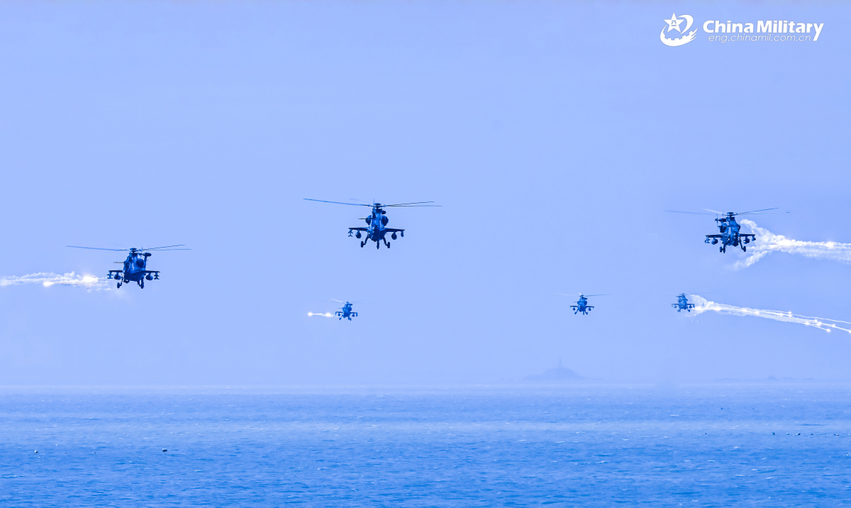 Z-10 attack helicopters attached to a brigade under the Chinese PLA Eastern Theater Command release flares to cover the low-altitude penetration during a multi-subject flight training exercise on September 12, 2025. (eng.chinamil.com.cn/Photo by Zhang Mao)
