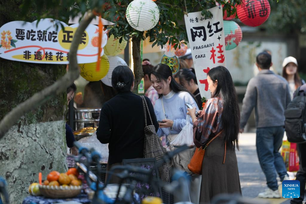 Tourists buy osmanthus cakes at Manjuelong Village in Hangzhou, east China's Zhejiang Province, Oct. 29, 2025. Recently, osmanthus flowers in Hangzhou have entered blooming period. More than 5 million osmanthus trees are planted across the city, according to local authorities. (Xinhua/Huang Zongzhi)
