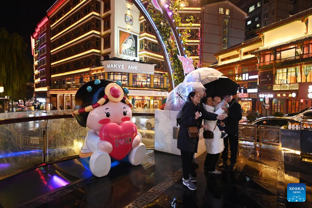 Tourists pose for photo in Kangding City, Ganzi Tibetan Autonomous Prefecture, southwest China's Sichuan Province, Nov. 1, 2025. In recent years, Ganzi Tibetan Autonomous Prefecture has leveraged its natural scenic advantages to develop its cultural and tourism industry. From January to October this year, the prefecture has received over 40 million tourist trips, setting a new record for the same period. (Xinhua/Xiao Xiao)