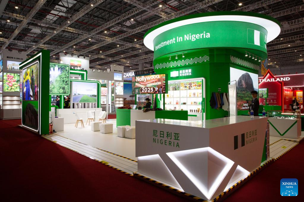 This photo shows the Nigeria Pavilion during the eighth China International Import Expo (CIIE) in east China's Shanghai, Nov. 5, 2025. The eighth CIIE opened here on Wednesday. Thailand, the United Arab Emirates, Nigeria, Georgia, Sweden and Colombia serve as the guest countries of honor at this year's CIIE. (Xinhua/Tian Weiwei)