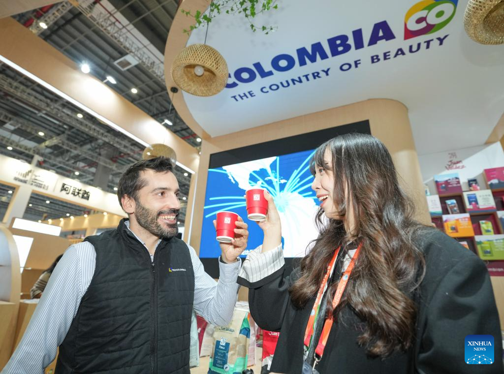 An exhibitor (L) and a journalist taste coffee at the Colombia Pavilion during the eighth China International Import Expo (CIIE) in east China's Shanghai, Nov. 5, 2025. The eighth CIIE opened here on Wednesday. Thailand, the United Arab Emirates, Nigeria, Georgia, Sweden and Colombia serve as the guest countries of honor at this year's CIIE. (Xinhua/Ren Pengfei)