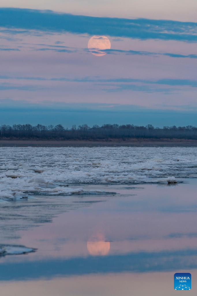 Photo taken on Nov. 5, 2025 shows a full moon pictured over the Jiayin section of Heilongjiang River in Yichun City, northeast China's Heilongjiang Province. (Xinhua/Xie Jianfei)