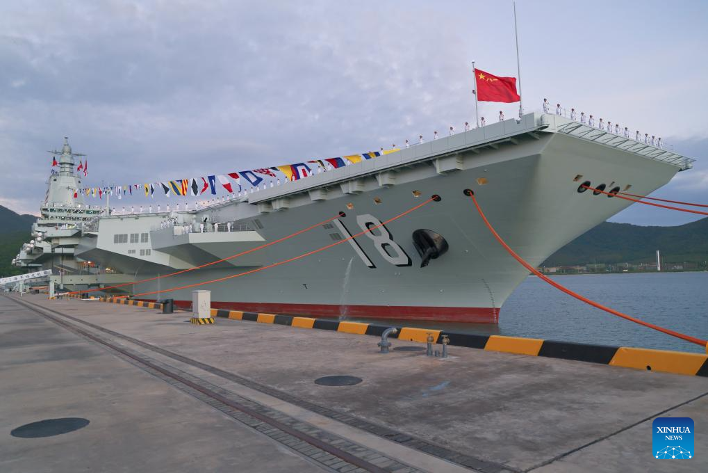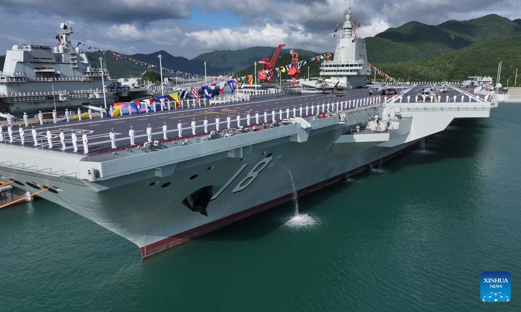 The commissioning and flag-presenting ceremony of the Fujian, China's first aircraft carrier equipped with electromagnetic catapults, is held at a naval port in Sanya City, south China's Hainan Province, on Nov. 5, 2025. The Fujian was launched in June 2022 and named after Fujian Province. (Xinhua/Li Gang)