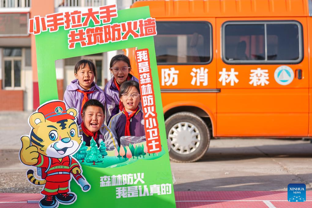 Students pose for a group photo during an educational activity about forest fire prevention at a primary school in Yinchuan, northwest China's Ningxia Hui Autonomous Region, Nov. 7, 2025. Currently, the risk of forest fire is high across the Helan Mountain. Staff members of local nature reserve administration have rolled out a series of educational activities with the theme of forest fire prevention, aiming to enhance students' safety awareness via lectures, equipment demonstrations, and hands-on experiences. (Xinhua/Yang Zhisen)
