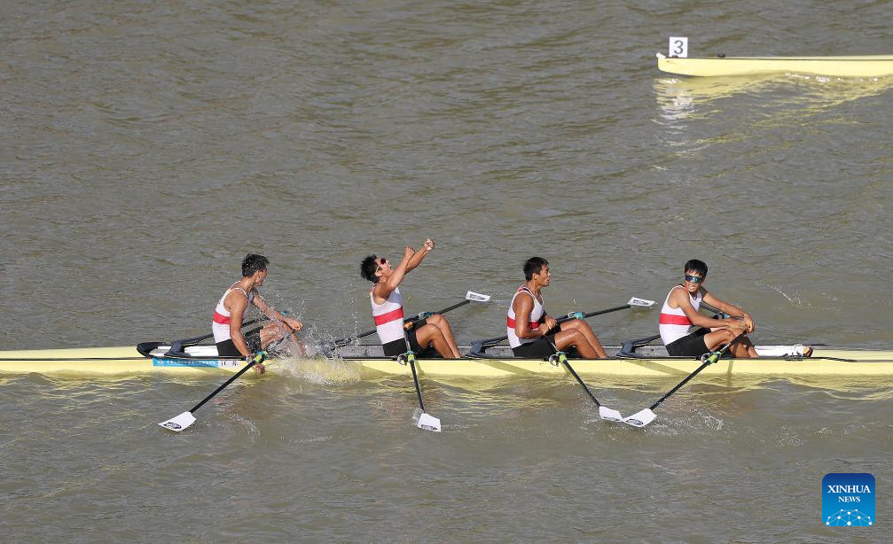 Teams compete during the men's quadruple sculls final of rowing at China's 15th National Games in Guangzhou, south China's Guangdong Province, Nov. 10, 2025. (Xinhua/Pan Yulong)