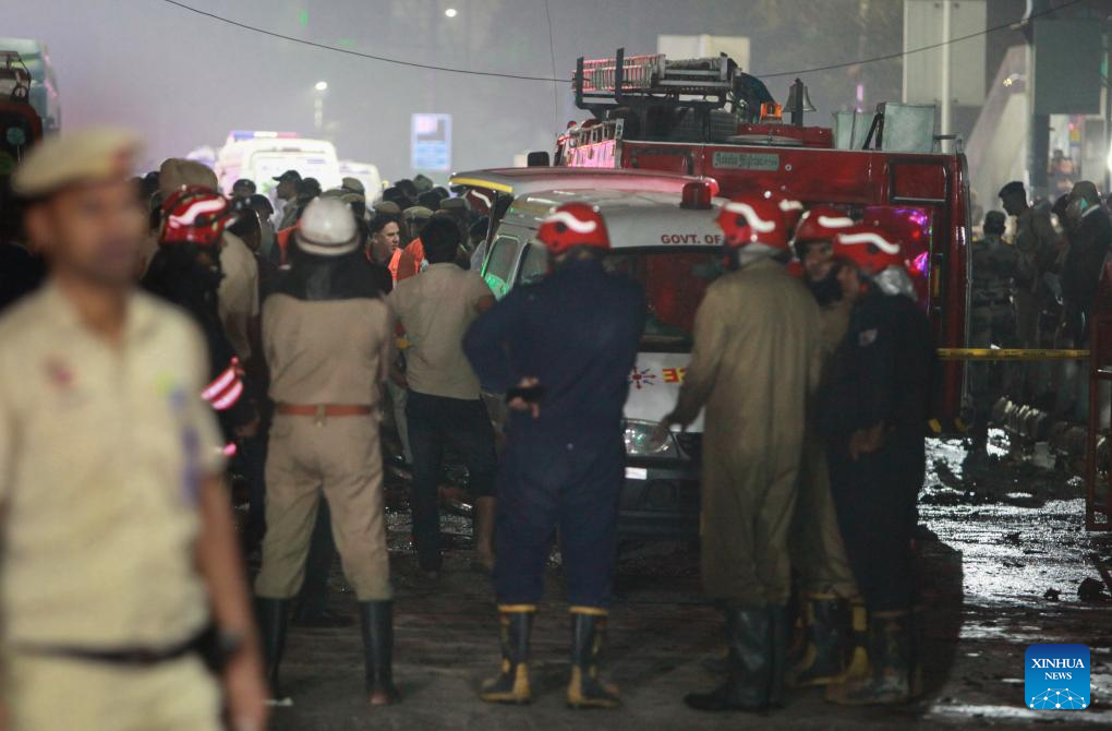 Indian policemen and firefighters gather at the site of a car blast near the Red Fort in New Delhi, India, Nov. 10, 2025. The death toll in Delhi's blast on Monday evening rose to eight, and some others were seriously injured and admitted to a local hospital, the "Aaj Tak" TV channel reported. Yet, there was no official confirmation. The cause of the blast could not be known. The blast occurred inside a car parked near the historic monument Red Fort in the Indian capital. (Str/Xinhua)