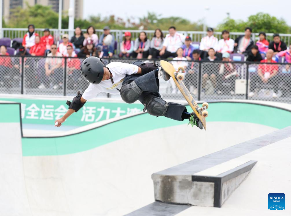 Zheng Haohao of Guangdong competes during the women's park final of skateboarding at China's 15th National Games in Huizhou, south China's Guangdong Province, Nov. 11, 2025. (Xinhua/Lu Hanxin)