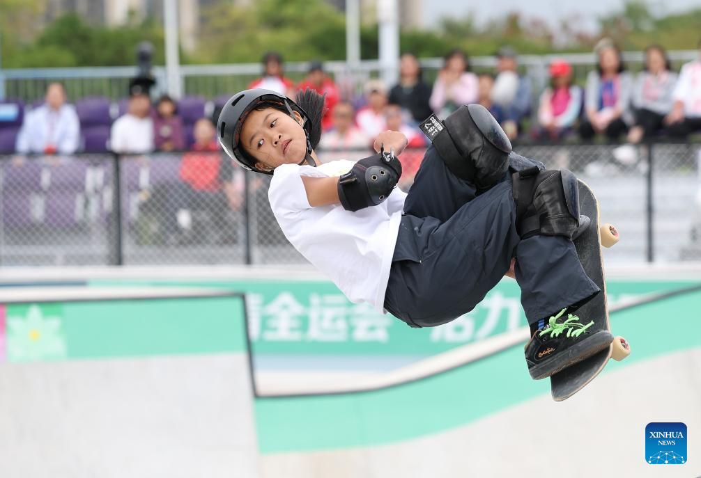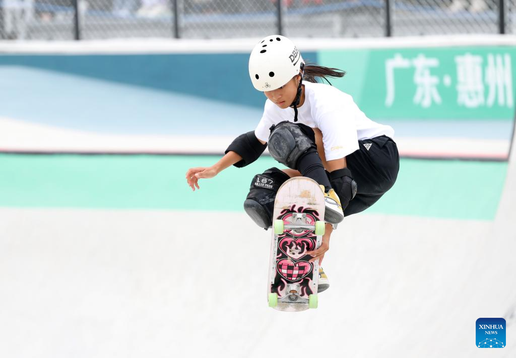 Zou Mingke of Guangdong competes during the women's park final of skateboarding at China's 15th National Games in Huizhou, south China's Guangdong Province, Nov. 11, 2025. (Xinhua/Lu Hanxin)