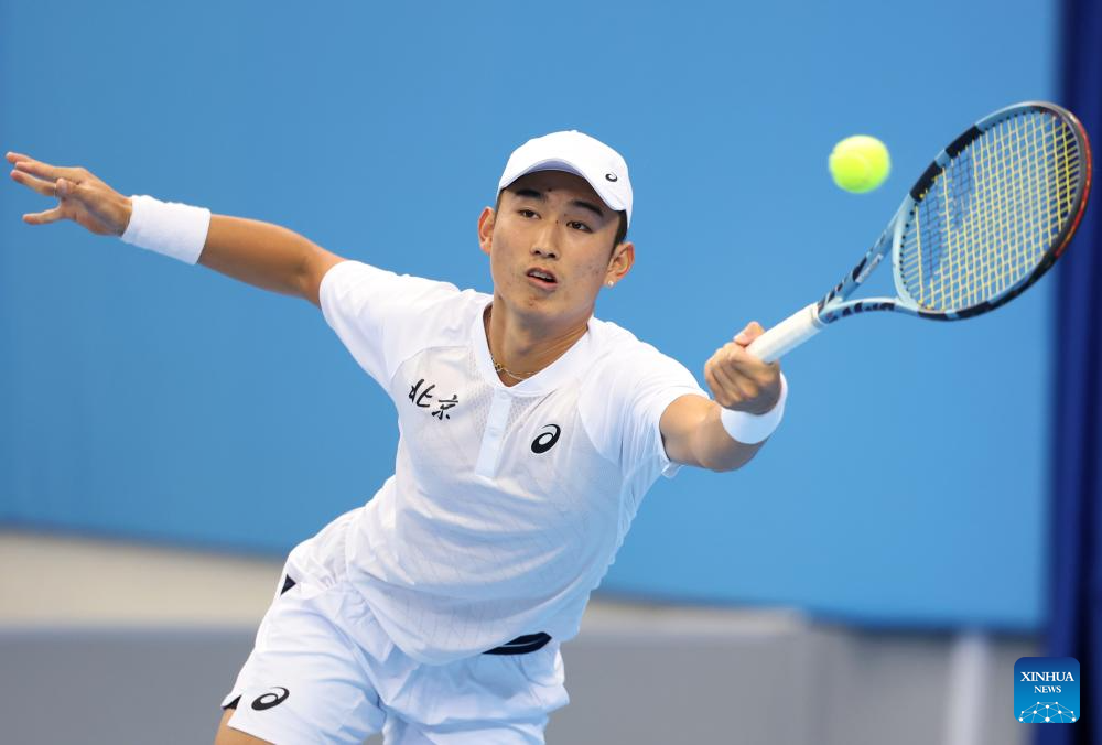 Shang Juncheng of Beijing competes against Zhou Yi of Guangxi during the junior men's team semifinal match between Beijing and Guangxi at China's 15th National Games in Hengqin, south China's Guangdong Province, Nov. 11, 2025. (Xinhua/Zhang Chenlin)