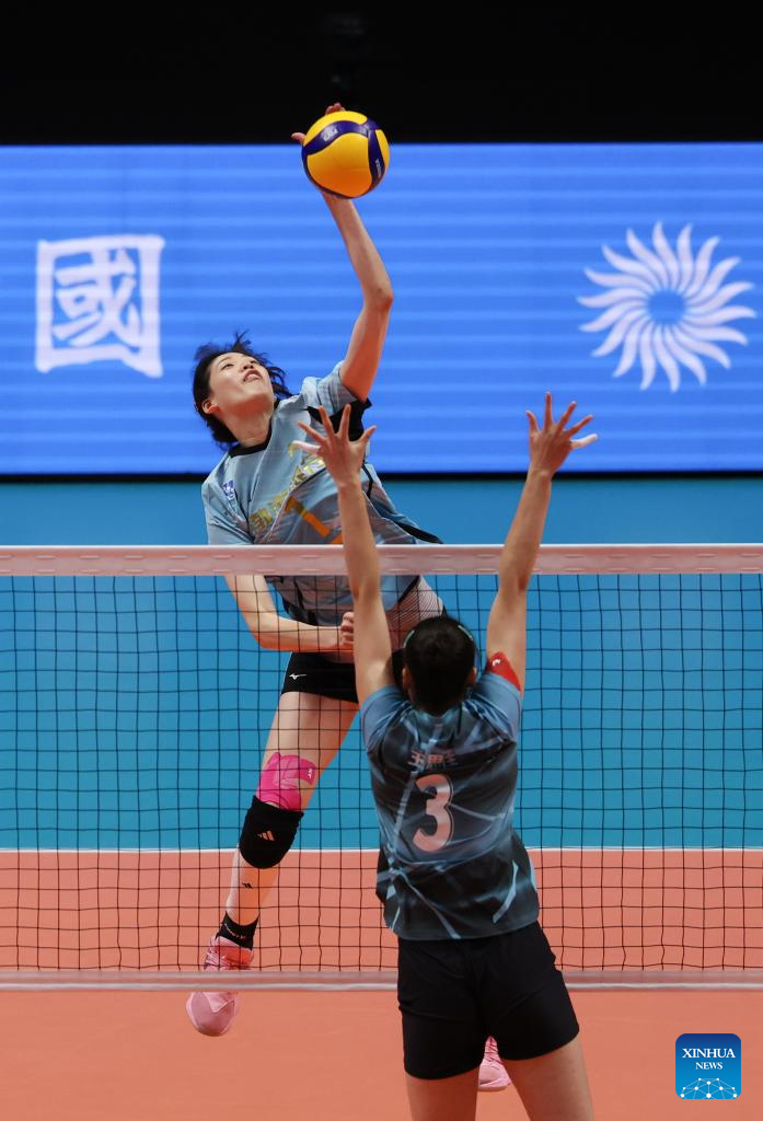 Li Yingying (top) of Tianjin competes during women's volleyball group A match between Tianjin and Sichuan at China's 15th National Games in Macao, south China, Nov. 11, 2025. (Xinhua/Sun Fanyue)