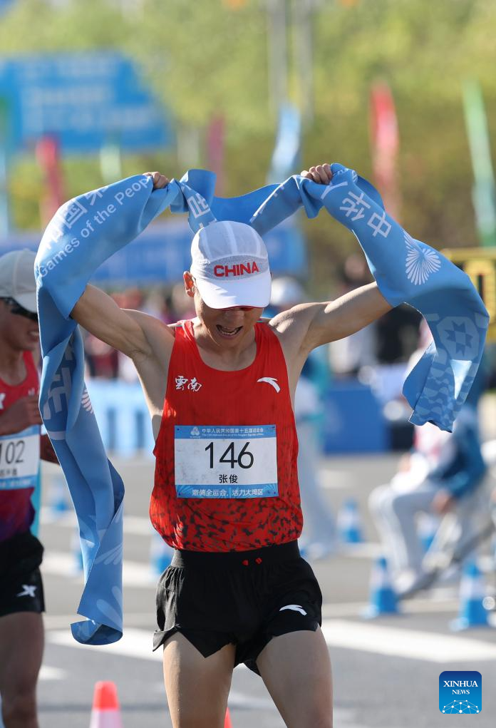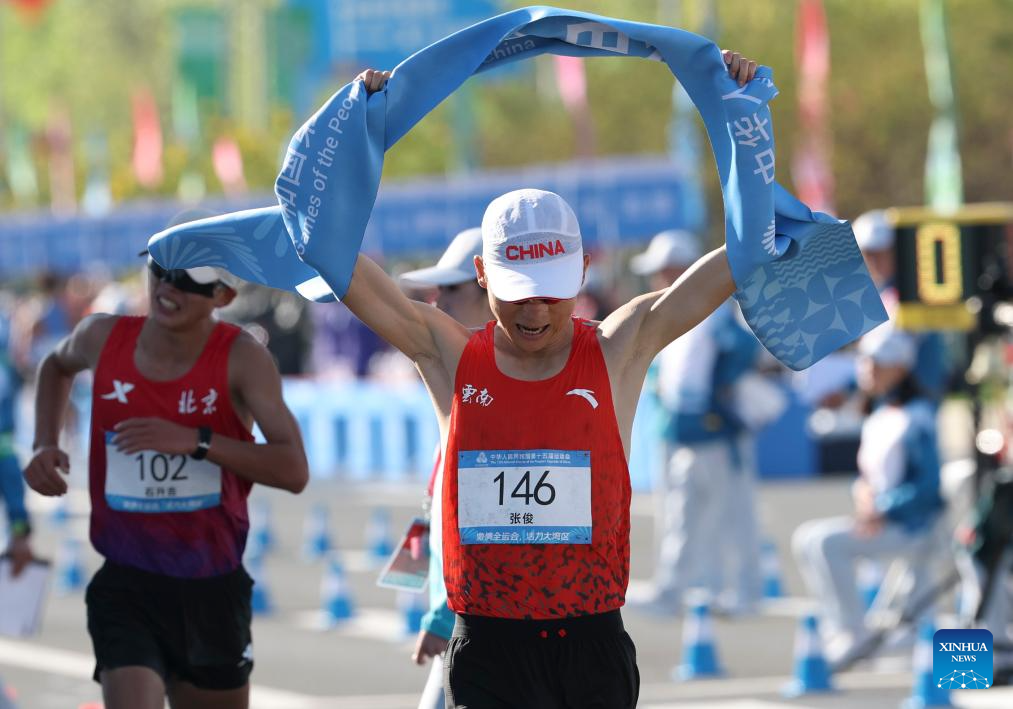 Zhang Jun of Yunnan crosses the finish line during the men's 20km race walk of athletics at China's 15th National Games in Zhuhai, south China's Guangdong Province, Nov. 12, 2025. (Xinhua/Mao Siqian)