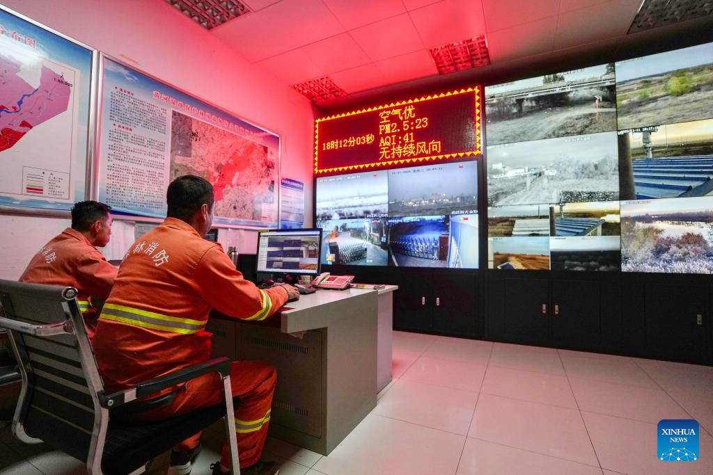 Staff members operate with an intelligent monitoring platform at the Tianhewan National Wetland Park in Pingluo County of Shizuishan, northwest China's Ningxia Hui Autonomous Region, Nov. 11, 2025. (Xinhua/Yang Zhisen)