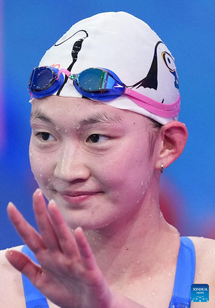 Li Bingjie of Hebei is seen after the women's 1500m freestyle final of swimming at China's 15th National Games in Shenzhen, south China's Guangdong Province, Nov. 12, 2025. (Xinhua/Xue Yuge)