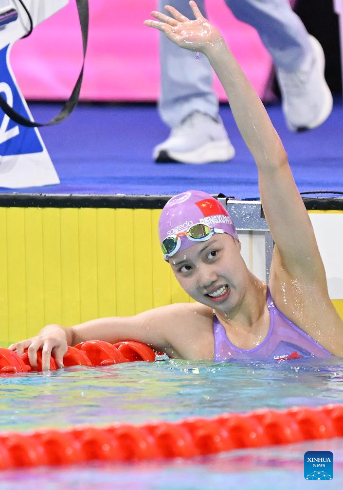 Peng Xuwei of Hubei reacts after the women's 100m backstroke final of swimming at China's 15th National Games in Shenzhen, south China's Guangdong Province, Nov. 12, 2025. (Xinhua/Du Yu)
