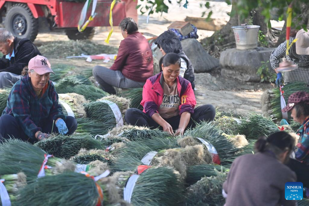 Villagers transfer chive bundles for sale in Jueshan Village of Sandu Town in Liuzhou City, south China's Guangxi Zhuang Autonomous Region, Oct. 28, 2025. Sandu Town has in recent years promoted the standardized and industrialized production of chives, and developed an integrated business system that ranges from planting and processing to sales and service. (Xinhua/Huang Xiaobang)