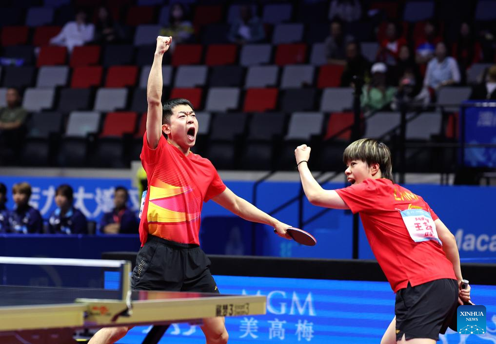 Lin Gaoyuan/Liu Shiwen (L) celebrate after winning the table tennis mixed doubles semifinal match between Lin Gaoyuan/Liu Shiwen of Guangdong and Yuan Licen/Wang Yidi of Liaoning at China's 15th National Games in Macao, south China, Nov. 13, 2025. (Xinhua/Liu Xu)