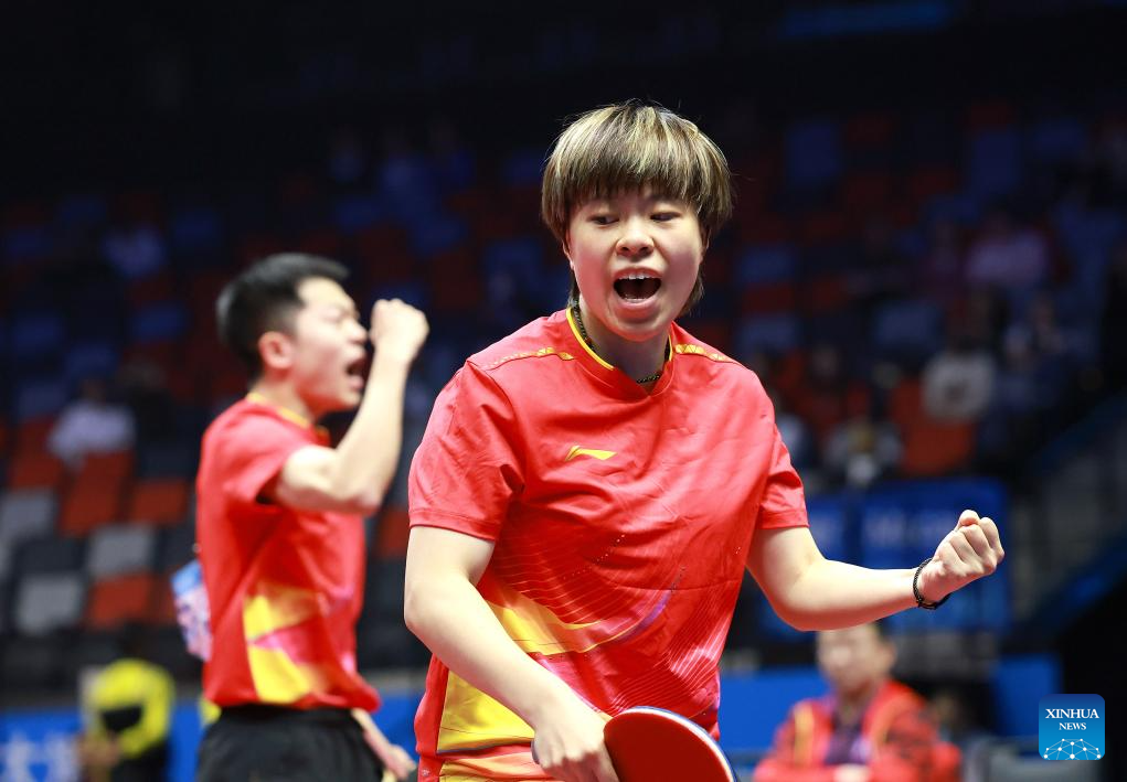 Yuan Licen/Wang Yidi (R) celebrate scoring during the table tennis mixed doubles semifinal match between Lin Gaoyuan/Liu Shiwen of Guangdong and Yuan Licen/Wang Yidi of Liaoning at China's 15th National Games in Macao, south China, Nov. 13, 2025. (Xinhua/Liu Xu)
