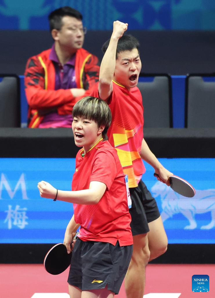 Lin Gaoyuan/Liu Shiwen (L) react after winning the table tennis mixed doubles semifinal match between Lin Gaoyuan/Liu Shiwen of Guangdong and Yuan Licen/Wang Yidi of Liaoning at China's 15th National Games in Macao, south China, Nov. 13, 2025. (Xinhua/Liang Xu)