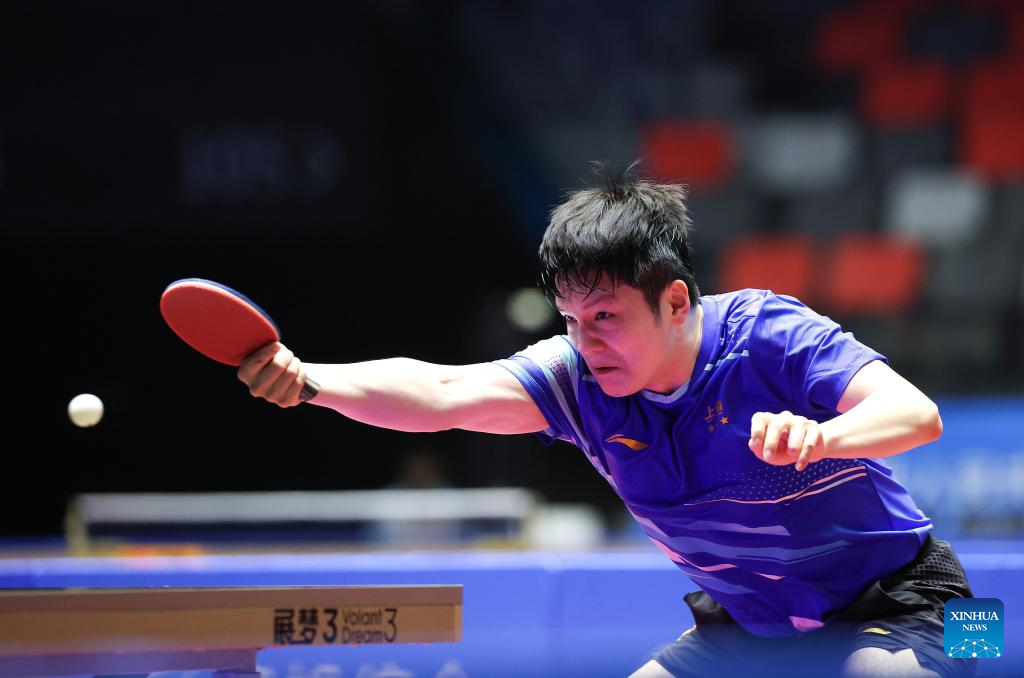 Fan Zhendong hits a return during the table tennis men's singles quarterfinal match between Fan Zhendong of Shanghai and Sun Zheng of Zhejiang at China's 15th National Games in Macao, south China, Nov. 13, 2025. (Xinhua/Liu Xu)