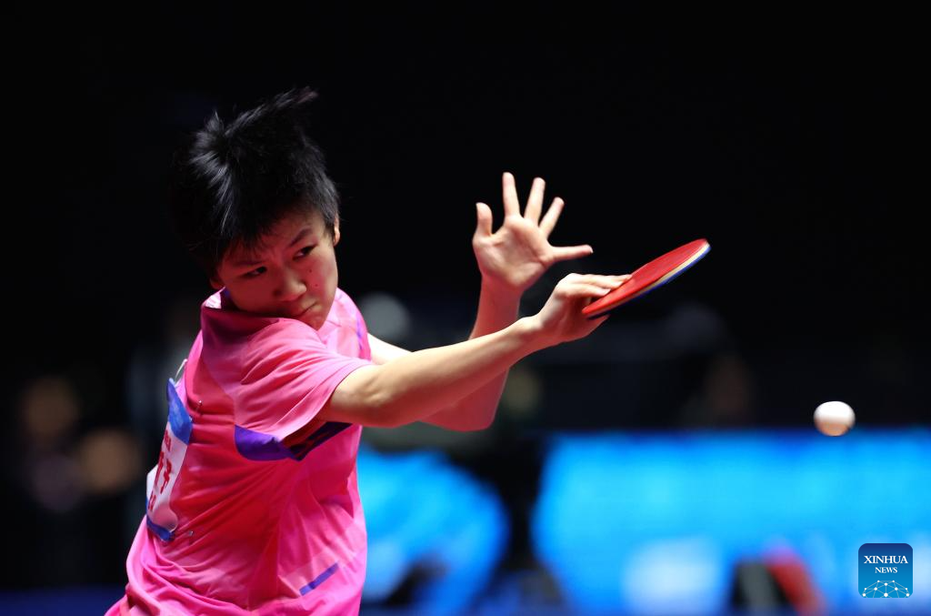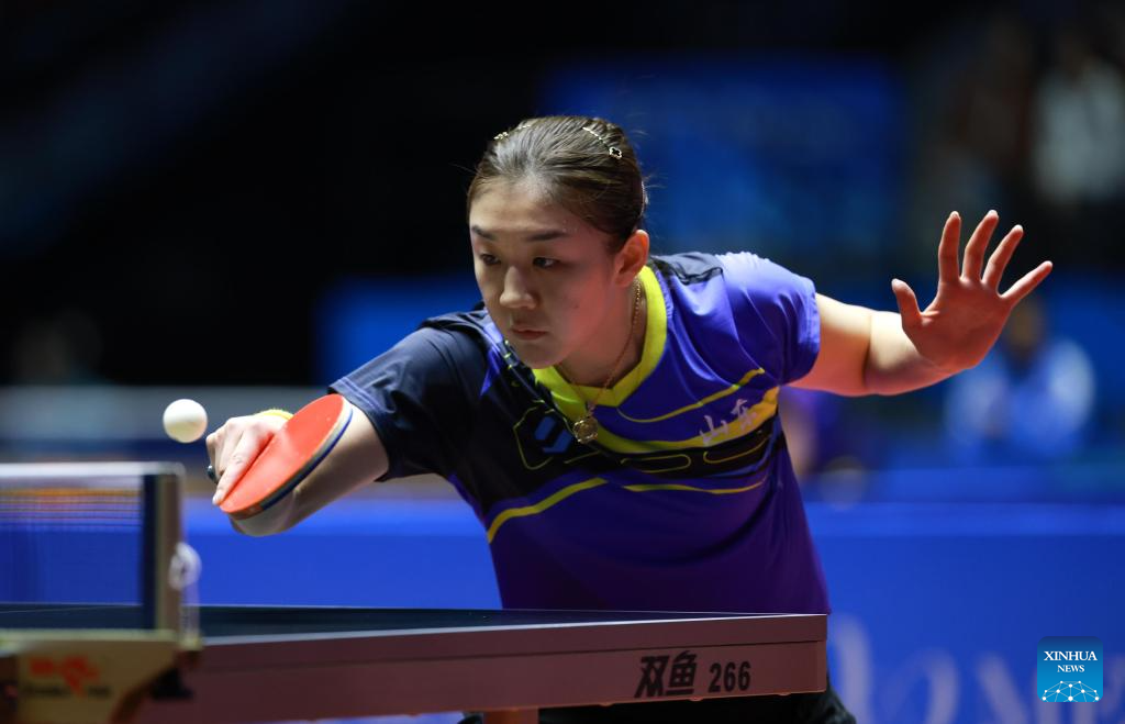 He Zhuojia hits a return during the table tennis women's singles round of 16 match between Chen Meng of Shandong and He Zhuojia of Hebei at China's 15th National Games in Macao, south China, Nov. 12, 2025. (Xinhua/Liu Xu)