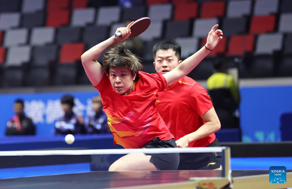 Lin Gaoyuan/Liu Shiwen (front) compete during the table tennis mixed doubles semifinal match between Lin Gaoyuan/Liu Shiwen of Guangdong and Yuan Licen/Wang Yidi of Liaoning at China's 15th National Games in Macao, south China, Nov. 13, 2025. (Xinhua/Liang Xu)
