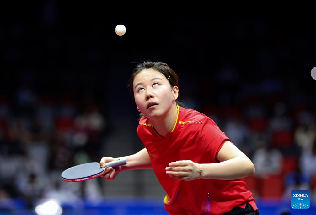 Chen Xingtong hits a return during the table tennis women's singles round of 16 match between Chen Xingtong of Liaoning and Zang Xiaotong of Hebei at China's 15th National Games in Macao, south China, Nov. 12, 2025. (Xinhua/Liu Xu)