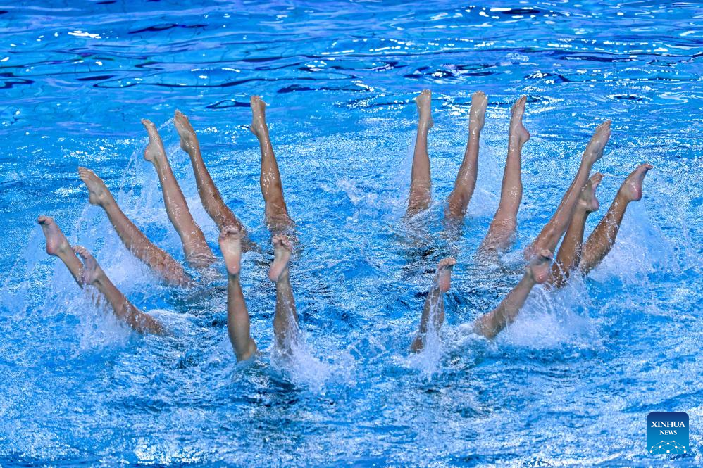 Team Beijing Sport University perform during the team technical of artistic swimming at China's 15th National Games in Jiangmen, south China's Guangdong Province, Nov. 13, 2025. (Xinhua/Chen Zhonghao)