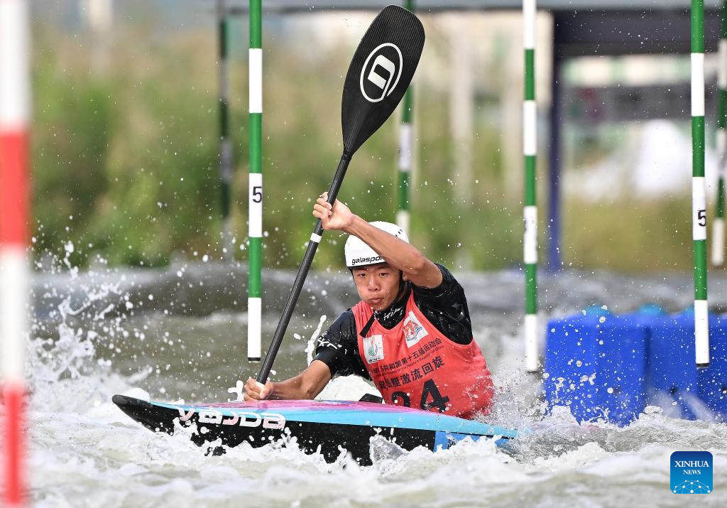 Quan Xin of Fujian competes during the men's kayak single final of canoe slalom at China's 15th National Games in Guangzhou, south China's Guangdong Province, Nov. 13, 2025. (Xinhua/Tang Yi)