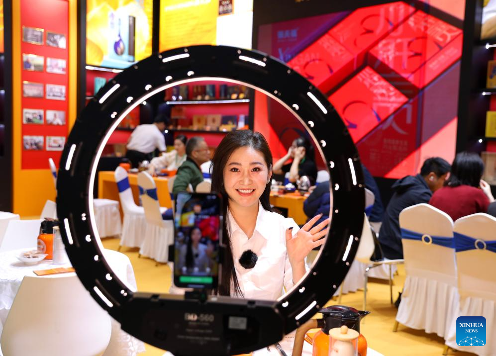 A live streamer works at the 17th Cross-Strait Tea Expo in Wuyishan, southeast China's Fujian Province, Nov. 16, 2025. (Photo by Huang Jiemin/Xinhua)
