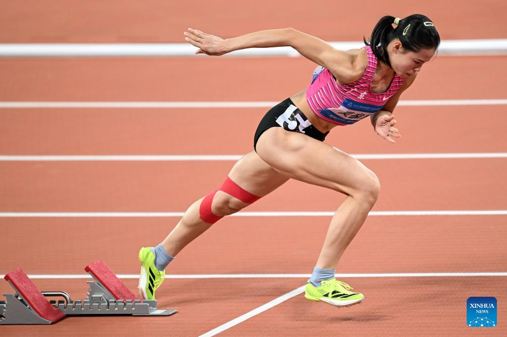 Mo Jiadie of Guangdong competes during the women's 400m hurdles final of athletics at China's 15th National Games in Guangzhou, south China's Guangdong Province, Nov. 17, 2025. (Xinhua/Jiang Han)